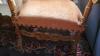 Antieken fauteuil met houten snijwerk en tapijtbekleding