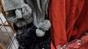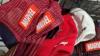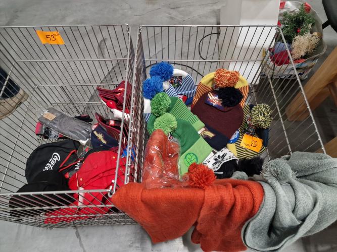 2 metalen netmanden / grabbeltonnen, met een hoeveelheid caps, 17-tal mutsen, 4 sjaals