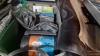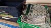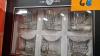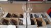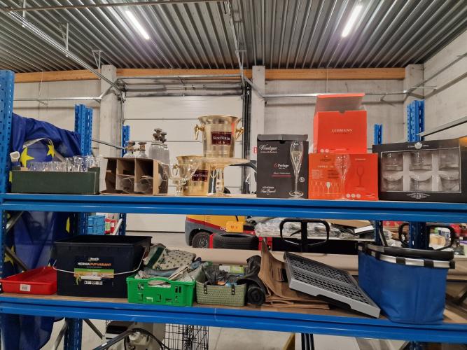 2 champagne-emmers ROEDERER + champagneglazen, set likeurglazen, diverse glazen, kelk en taartplateau, box, boodschappentassen, keukenhanddoeken, etc