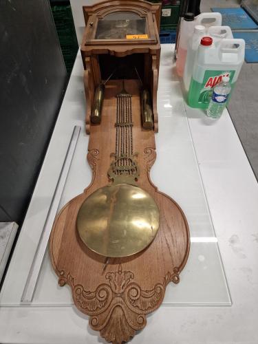 een antieke Comtoise hangklok, met grote messing slinger en houten behuizing in traditioneel Frans landelijk design, met gewichten