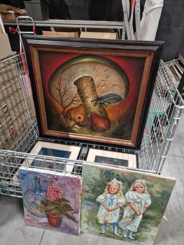groot 80x90 schilderij, ingekaderd, op doek, getiteld "EENZAME", getekend DELTO + 2 kleinere schilderijen op doek, getekend, ingekaderd + 2 kleinere schilderijen