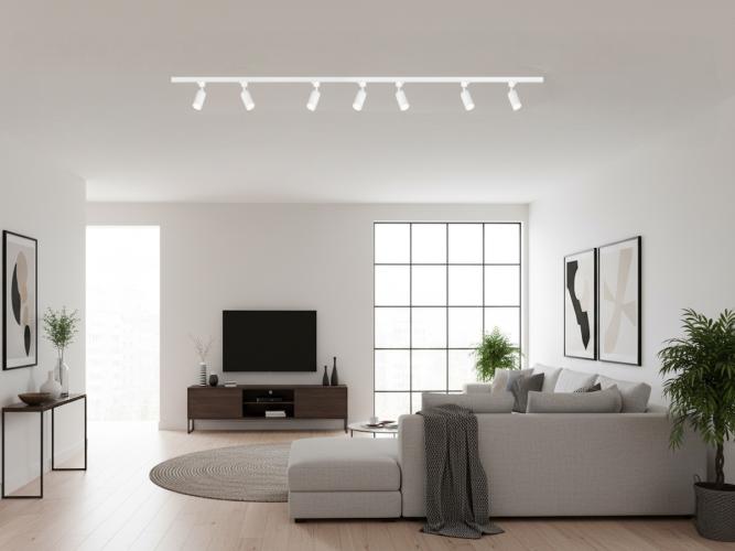2 x 1 stuk 100cm en 1 stuk 200cm rail - materiaal aluminium - bevestiging inclusief - 220-240V - afdichting IP20 - 1 stuk door verbinder en 1 stuk L verbinding inclusief - product kleur zand wit- 9 stuk railspots GU10 armatuur afm. Ø 55 x 102mm draaibaar 350° en kantelbaar 90° materiaal aluminum kop en kunstof basis - bulb niet inbegrepen - de rail kan eenvoudig op de gewenste lengte worden gezaagd - geschikt voor binnen - SKU 828 SKU 826 SKU 906 SKU 908 SKU 1122