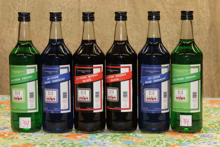 6 flessen likeur 1 liter 2 x black vodka 15 %2 x pisang 15 % alc+2 x curacao 15% alc