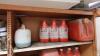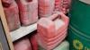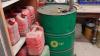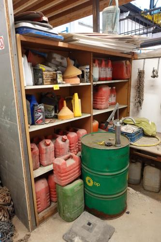 26x jerrycan & rest producten + 5x vat in metaal met pomp