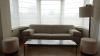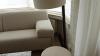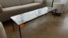 Zitbank in stof 2300x900 samen met tafel met natuursteen blad 1500x400x390 2x poef & lamp