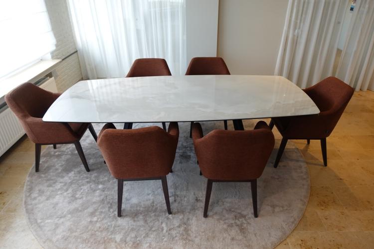 Design eettafel 2400x1100x740, 6x stoel & tapijt