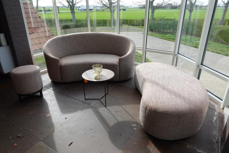 2x zitbank in stof 1850x900, poef & bijzettafel