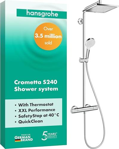 Ongebruikt, volledig, ok, beschadigde verpakking, Hansgrohe Crometta E 240 Douchesysteem, Regendouche met 1 Straalsoort (Hoofddouche, Handdouche met Slang, Douchestang en thermostaat), chroom, 27271000, B01MG2DESU