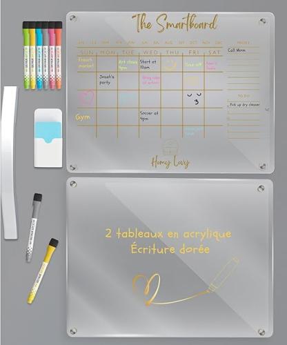Ongeopend, ok, HOMY LOVY Set van 2 transparante en gouden koelkastborden, kalender en magnetische planning, droog afwasbaar, Hebdo maaltijdplanner, gezinsorganisatie, 40 x 30 cm, 8 markers, gum en houder, B0C6QZ9R9Q
