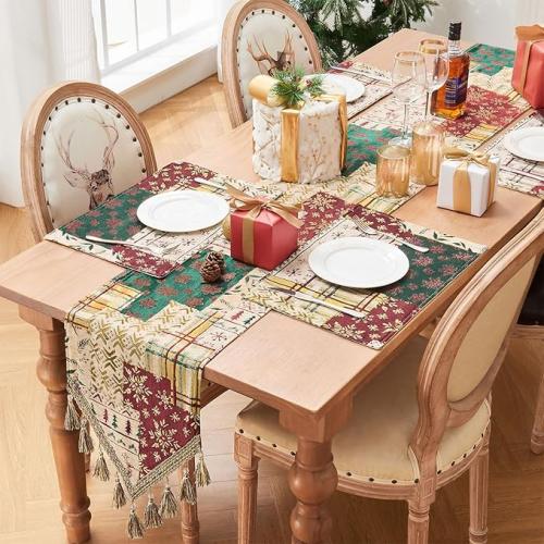 Ongeopend, ok, Topluxe Kerst Tafelloper met Kwastjes, Dubbellaags Damast Tafelkleed voor Eettafel/ Eetkamer/ Restaurant/ Festivaldecoratie (33x228 cm, Patchwork), B0FLXCMWGK