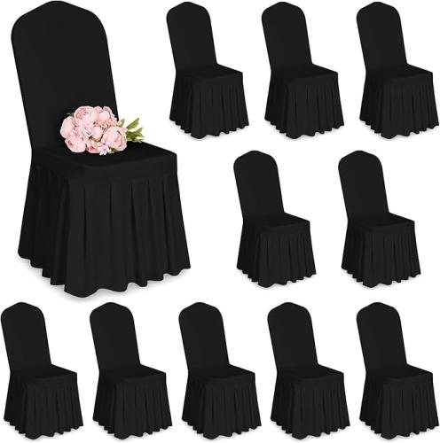 Ongeopend, in seal, ok, 10 stuks stoelhoezen zwart polyester spandex lycra stretch stoelhoes met rok, eetkamer bruiloft stoelhoezen universele wasbare beschermende stoelhoezen voor bruiloftsfeest banket decoratiehoezen,B0DCS9WWCG