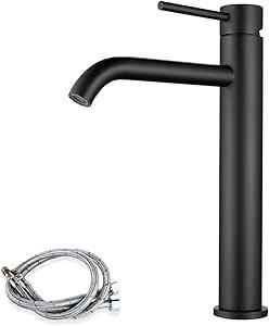Ongeopend, in seal, Maynosi hoge wastafelkraan, armatuur met uitloop hoogte 195 mm, zonder afvoergarnituur, waterkraan badkamer met flexibele slangen, modern minimalistisch design, matzwart, matzwart, B0DKBFS7JR