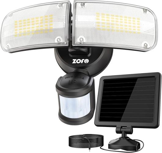 Ongeopend, in seal, ZOFO Solarlamp met bewegingsmelder, Voor Buiten Zonnelampen Zonne Bewegingssensor Lamp 1800 Lumen Buiten Zonne Geleide Licht met 2 Koppen, 5000K, IP65, het Openlucht Zonne Licht wandlamp voor garage, B0B3DTTJSJ