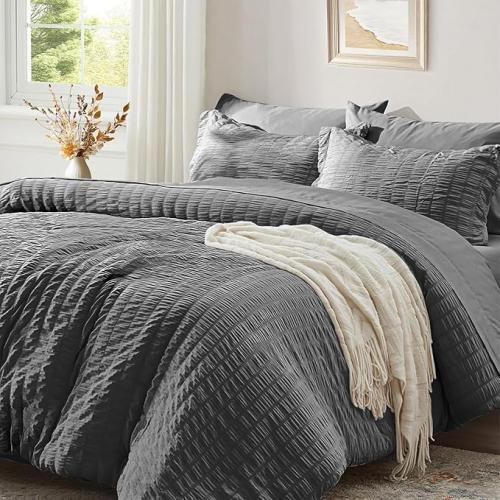 Ongeopend, ok, Seersucker Beddengoed (135 x 200 cm), 4-delig, grijs, donkergrijs, gestreept, zomer, effen, omkeerbaar, microvezel, ademend, licht, dekbedovertrekken 135, 200 cm en kussenslopen 80 x 80 cm, B0D7CZQMY3