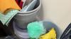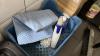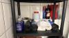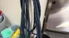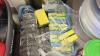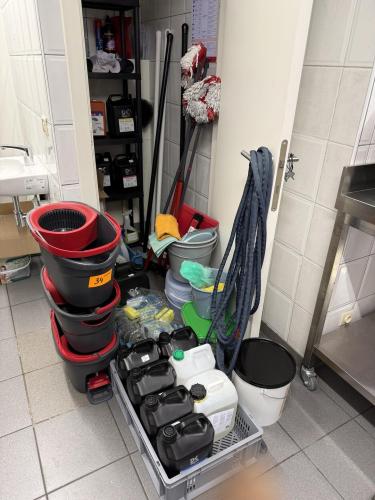 belangrijk lot diverse materiaal voor reinigen : mooie hoeveelheid producten en materiaal (wo. Onaangebroken!), waterdarm, kuisemmers, borstels, PVC-stapelrek, sponsen, afvalzakken,…