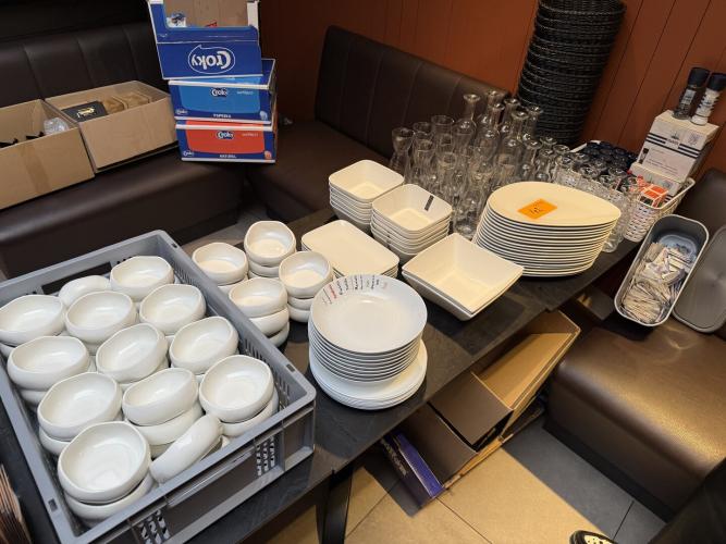 karaffen, zout- en pepermolens, broodmandjes, borden, slakomen, soepbollen, etc.