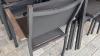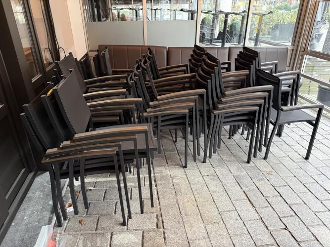 33 stapelbare terrasstoelen met armleuning, zwarte kleur, merk SUPER SEAT ( staande op terras )