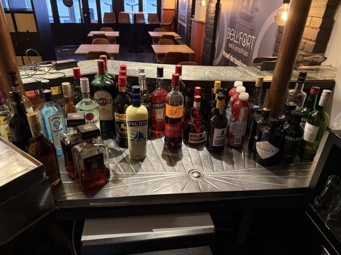 volle en aangebroken flessen dranken, waaronder PICON, WODKA, GIN, GRAND MARNIER, MARTINI, PORTO,…