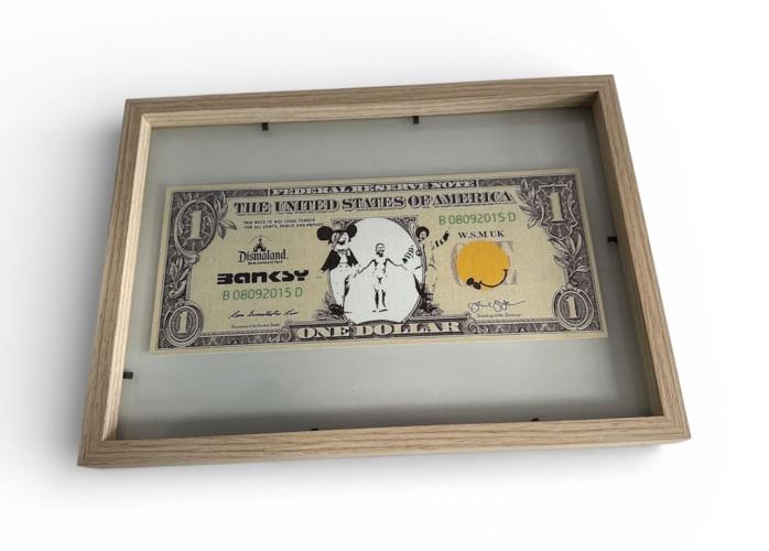 Waardering expert : € 300 /€ 400 - Banksy is een in Engeland gevestigde straatkunstenaar , politiek activist en filmregisseur die onder een pseudoniem werkt. Dismaland was een tijdelijk kunstproject georganiseerd door straatkunstenaar Banksy in de badplaats Weston-super-Mare in Somerset , Engeland. De pop-up tentoonstelling in het Tropicana , een verlaten zwembad , werd in het geheim voorbereid en was "een sinistere variant op Disneyland ". De ingekaderde Dismaland Dollar werd verkocht als souvenir aan de bezoeker van deze tentoonstelling. Zeer mooie presentatie is een houten kader van 31,5 x 32,5 cm., voorzien van plexi-glas.