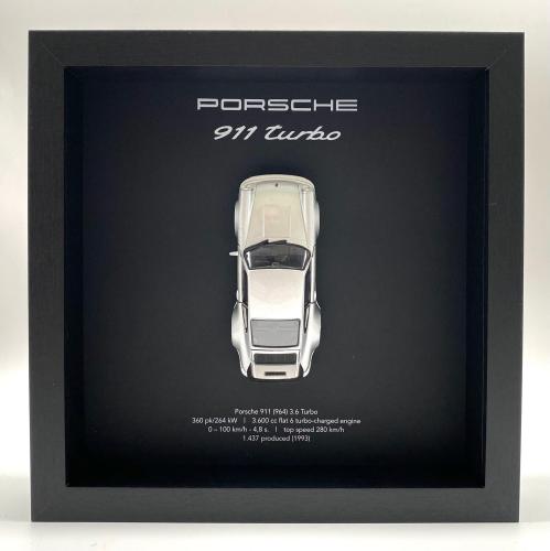 Waardering expert : € 200 - 3D-fotolijst met een Porsche 911 (930) Turbo uit 1975 - zilver - gelimiteerde oplage 28/50 stuks. - Een designstuk voor elke autoliefhebber en designfanaat. - Een prachtige en stijlvolle toevoeging aan elk interieur. - Lijst: zwart op zwart, 25x25x5 cm, hout/geen plexiglas. - De auto is nieuw, schaal 1/36. - Met COA