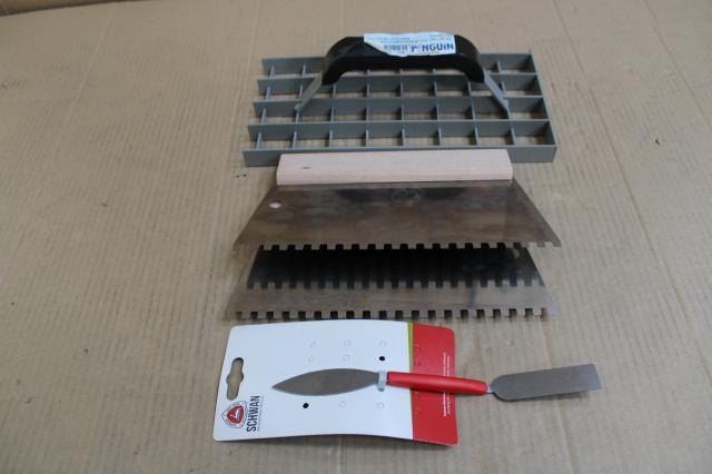 Plm 4 stuks, Ongebruikt, Partij werkmateriaal, 1 x Gipsrooster rechthoekig - 290 x 140 mm + 1 x Plaastervoegmes 20 mm vlak en gepunt + 2 x Stalen lijmkam, houten greep, vertanding 6 x 6 mm C2 - 250 mm