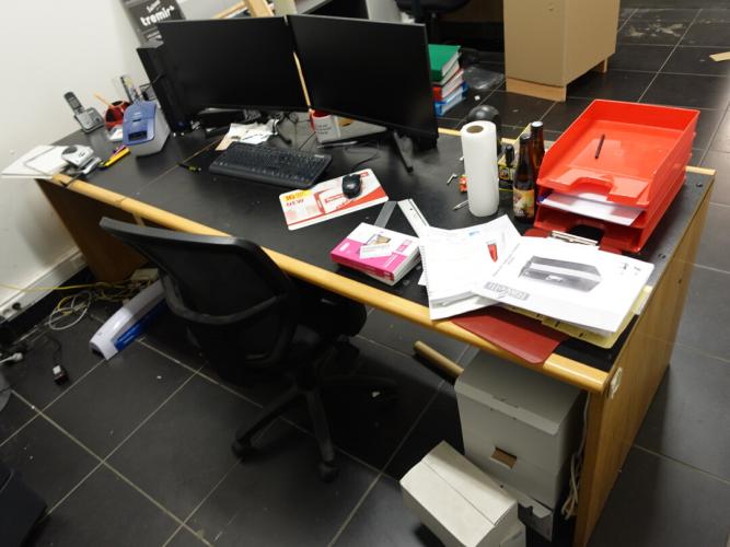 vv: bureau , 2 schermen samsung, computer Asus , rek , presentatierek , 2x bijzetkastjes, .... alles moet mee exl lot 30