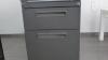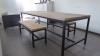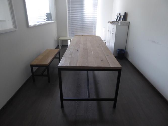 Metalen tafel met houten blad(2600x900x760) bijpassende bankjes(120x380x450) 2x dossierkast+ inhoud met sleutel, bureaukastje