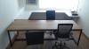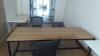 metalen tafel met houten blad 2600x910, 3 bureaustoelen, bijzettafel, kader