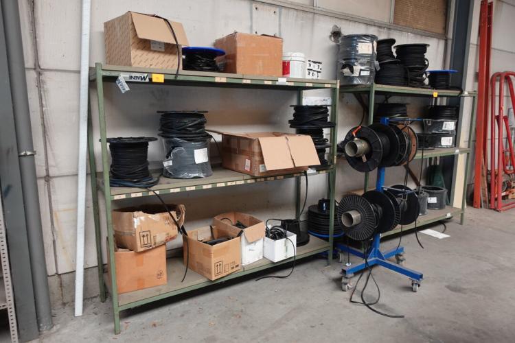 3x diverse rekken met inhoud, Shuco diversen , verrijdbaar kar met 4x rol, diverse ijzerwaren...