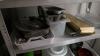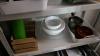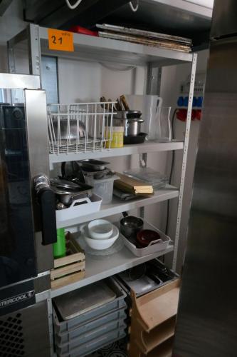 Opbergrek met inhoud : plastieken bakken - gastronormbakken - maatbekers - schuimspanen - ovenschotels- schalen enz...