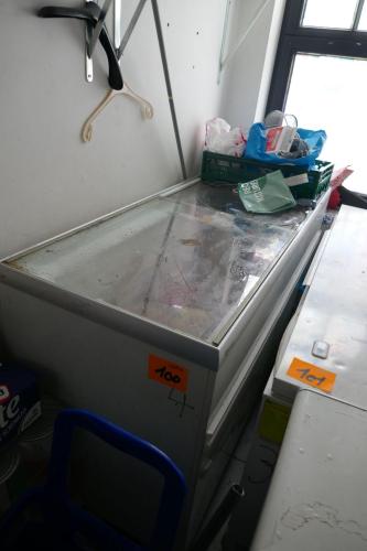 Vrieskist met schuifdeksel witte kleur + inhoud : bevroren voedingswaren (graag te bezichtigen )