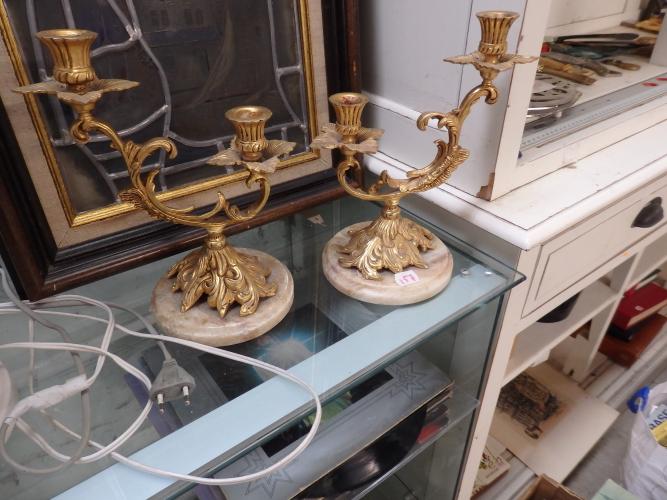 paar bronzen kandelaars op marmer